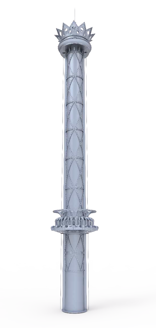 旋轉太空梭集傳統跳樓機豎直升降運動和旋轉運動于一身,運動方式多樣新穎,其簡形塔架可繞其自身下端轉動,滑行架跟隨塔架旋轉的同時支撐座椅沿塔架豎直軌道做升降運動。