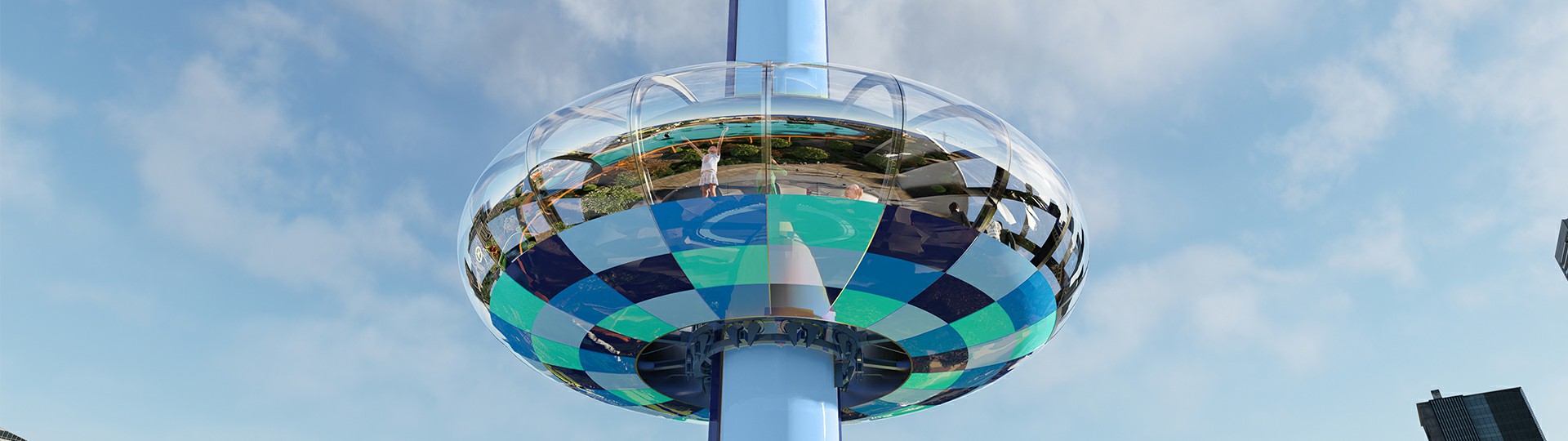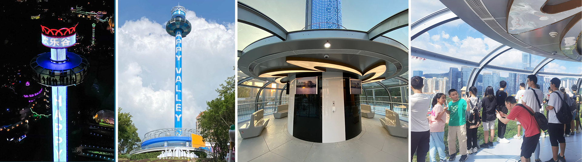 觀景塔擁有可容納100人的“甜甜圈”旋轉(zhuǎn)艙體,載客能力強(qiáng)。雙自動(dòng)門(mén)進(jìn)出口的設(shè)計(jì)便于快速上下客,運(yùn)營(yíng)高效。乘客在旋轉(zhuǎn)艙中360°環(huán)繞式縱情飽覽四周美景,還可通過(guò)艙內(nèi)影音系統(tǒng)感受多元視覺(jué)盛宴。夜幕降臨燈光閃耀,璀璨奪目輕易打造夜場(chǎng)焦點(diǎn),成為聚客地標(biāo)。